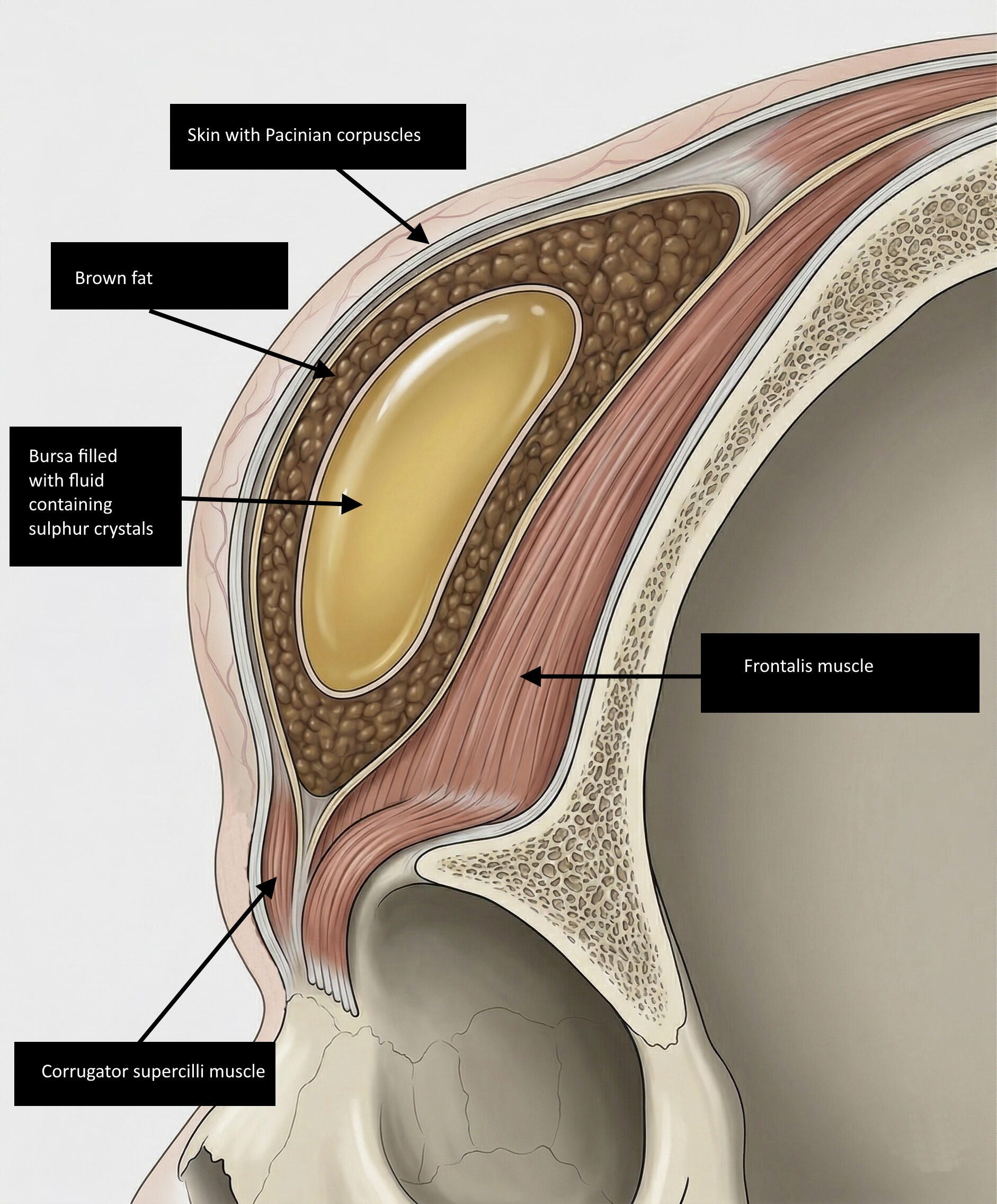 Evolution is a very efficient process, and it often repurposes existing biological and anatomical structures to build new organs. The Echo-vision organ is simply a bursa, surrounded by brown fat and covered by a tight, thin layer of skin rich in Pacinian corpuscles.Evolution doesn't have an end goal to develop a new organ. These are simply cumulative changes, where each step has a benefit. A bursa on the forehead helps a rock climbing creature cushion its forehead against the vertical rock wall. A layer of brown fat developing around it helps protect the bursa from bursting in an impact. For a creature living in growing darkness, touching foreheads to transmit vibrations would be a form of identification. The concentration of Pacinian corpuscles would grow to better facilitate this. With the concentration reaching a specific threshold a re-wiring of the brain changes the function of the organ. From then on, the skin becomes even more saturated with vibration-sensing nerve endings.A new organ is formed.