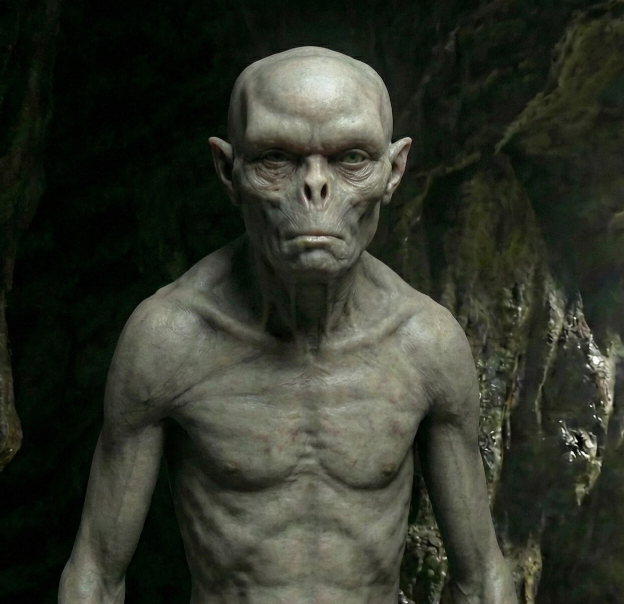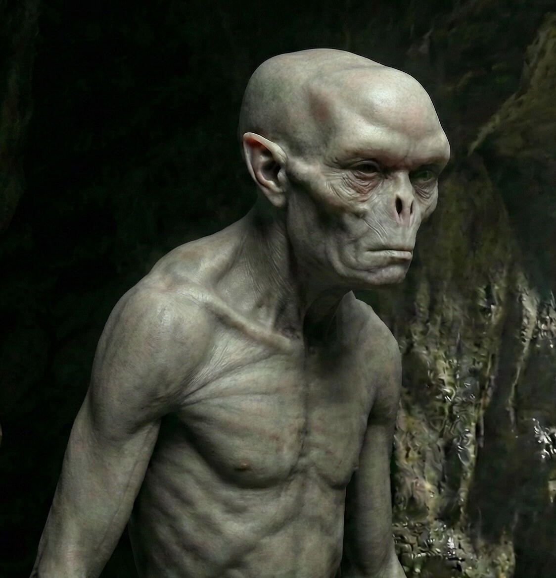 In a warm, humid environment, where temperature hardly changes, thermoregulation will start ramping down. Over time, the body temperature of the hominins will slowly lower to the same level as the environment. This conserves energy, and also has a side-effect in terms of digestion, that we will come to later.Within tens of thousands of years, the skin will slowly lose the coarse hairs, becomes thin and depigmented. Melanin production is energy expensive, and in permanent darkness it confers no selective advantage whatsoever.Eyes will reduce, using only the faint bioluminescence from fungi for near vision. The warm, damp air will reduce the need for large nasal cavities or sinuses. They will reduce considerably, enhancing the flatness of the face.Body size would decrease under the caloric constraints of a closed ecosystem. Homo naledi was already small — around 1.5 metres and 40 kilograms. Homo tenebris would be smaller. The long curved fingers, already adapted for climbing, would become more pronounced. The shoulder joints, already angled for vertical movement, would exaggerate that orientation further.And something new would emerge. Not through invention but through the same patient selection that drove everything else. The echo-vision organ. The structure that Milos Kavsek recognises immediately for what it is — not a pathology, not an anomaly, but an adaptation. The most sophisticated sensory innovation in hominin evolution since the eye itself.