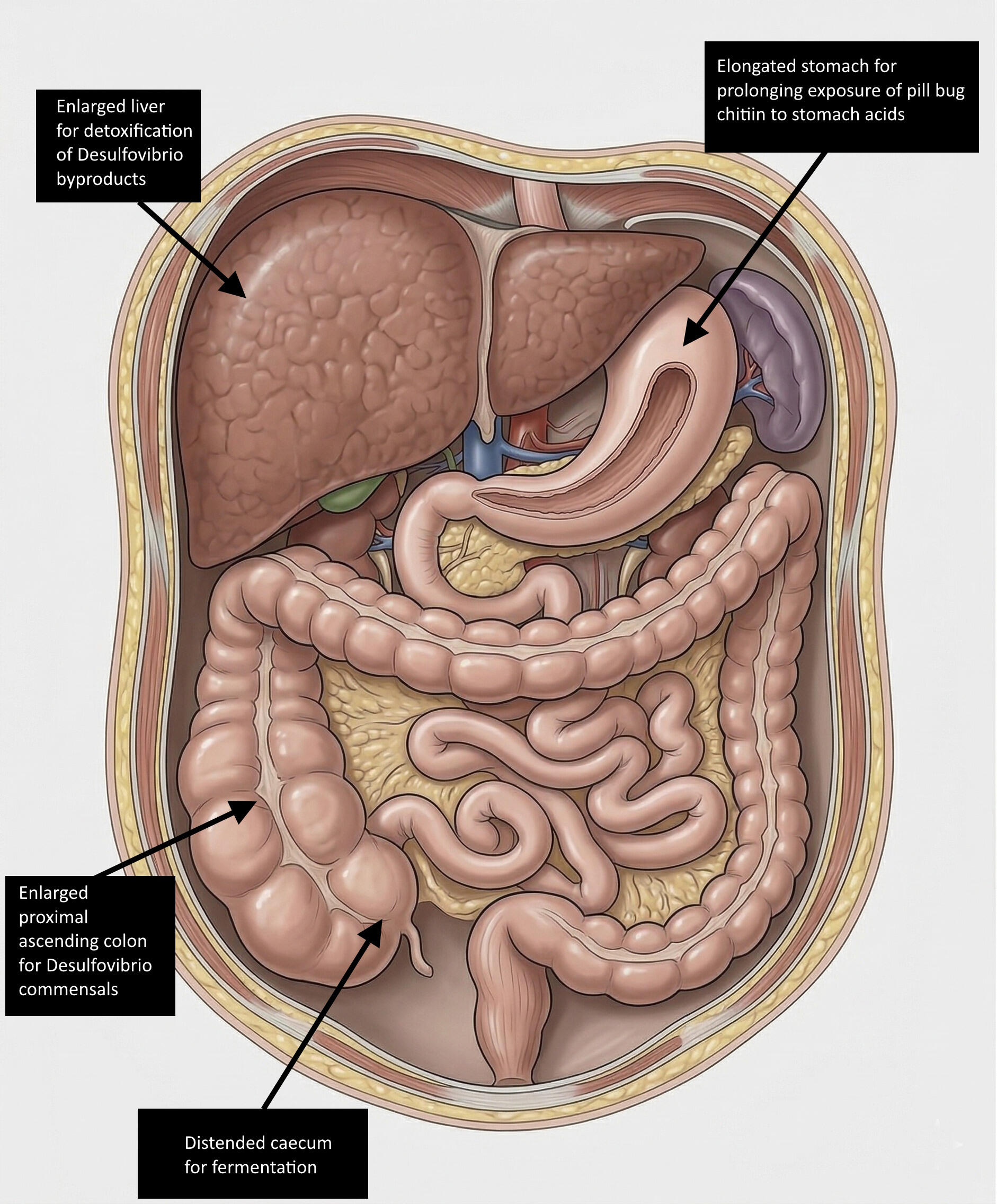 As the hominins adapt to eating large quantities of pill bugs and fungus along with the voles, they develop adaptations for fermentation, to extract the maximal amount of nutrition. The proximal ascending colon enlarges to host anaerobic Desulfovibrio that convert elemental sulphur and sulphur-rich compounds in the diet to fatty acids that the hominins can absorb. The liver enlarges to detoxify the byproducts of Desulfovibrio, occupying nearly a quarter of the abdominal cavity. The low core body temperature, at 30 degrees Celsius, lower than that of any known primate, keeps Desulfovibrio at its preferred optimal temperature.