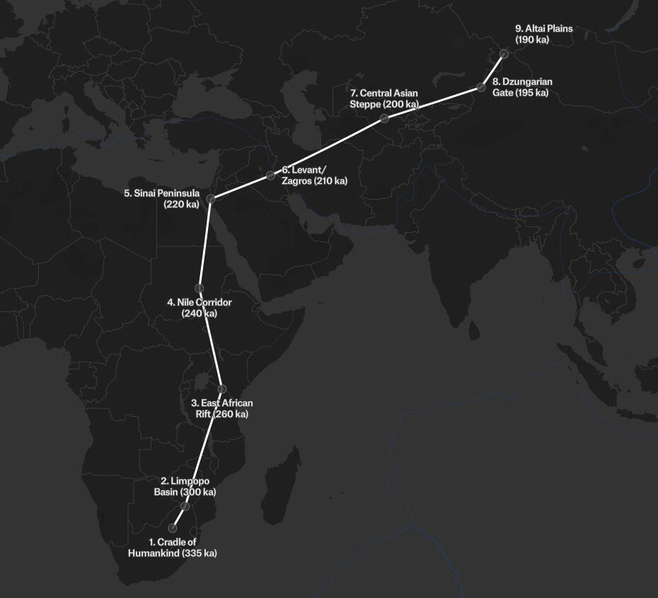 Homo naledi lived in the Cradle of Humankind in South Africa around 335,000 years ago. The Altai foothills of Siberia are roughly 12,000 kilometres away. The obvious question is: how did they get there?The same way everything gets anywhere. One generation at a time, following the food.Hominins were not static. Homo erectus walked out of Africa and reached Southeast Asia more than a million years ago. Denisovans — identified from a single finger bone in a cave in the Altai mountains — were in Siberia at least 50,000 years ago. The driving mechanism in every case was the same: climate. When conditions changed, the animals moved, and the hominins that ate them moved too.Here is how I modelled the migration, waypoint by waypoint: